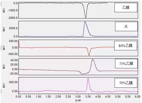 從圖中可以看出,試樣為70%乙腈和80%乙腈時溶劑峰已經(jīng)變小許多,而以流動相為樣品(75%乙腈)時溶劑效應(yīng)得到了進一步的降低,也就是人們常說的,可以嘗試用流動相配制標準溶液或者定容樣品減輕溶劑效應(yīng)。