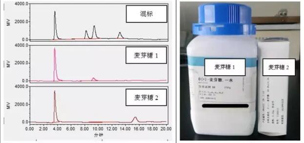 難道是色譜柱的原因?色譜柱柱效下降導(dǎo)致兩者不能分離?于是更換新的色譜柱再次分離,結(jié)果還是沒有能夠?qū)烧叻蛛x。如果葡萄糖和麥芽糖無法分離,實驗便無法進行下去,在經(jīng)過上述嘗試之后將問題的矛頭指向了所用的試劑。查試劑臺賬,發(fā)現(xiàn)實驗室里還有其他品牌分析純的葡萄糖,而麥芽糖僅此一瓶,但是幸運的是發(fā)現(xiàn)了葡萄糖和麥芽糖的標準品,決定使用麥芽糖和葡萄糖的標準品試一下。